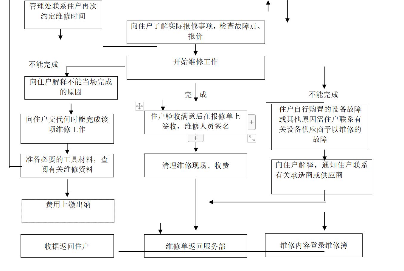 4.1.1 保修原则:工程部通知开发商并组织施工单位进行维修,维修费用由开发商从施工单位保修款中扣除。